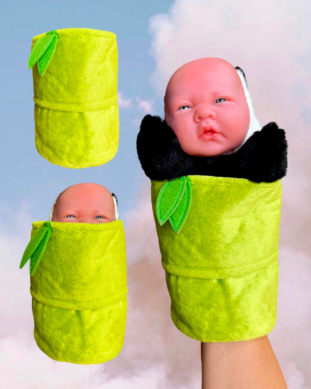 - Baby face head on panda/bamboo body, HAND PUPPET