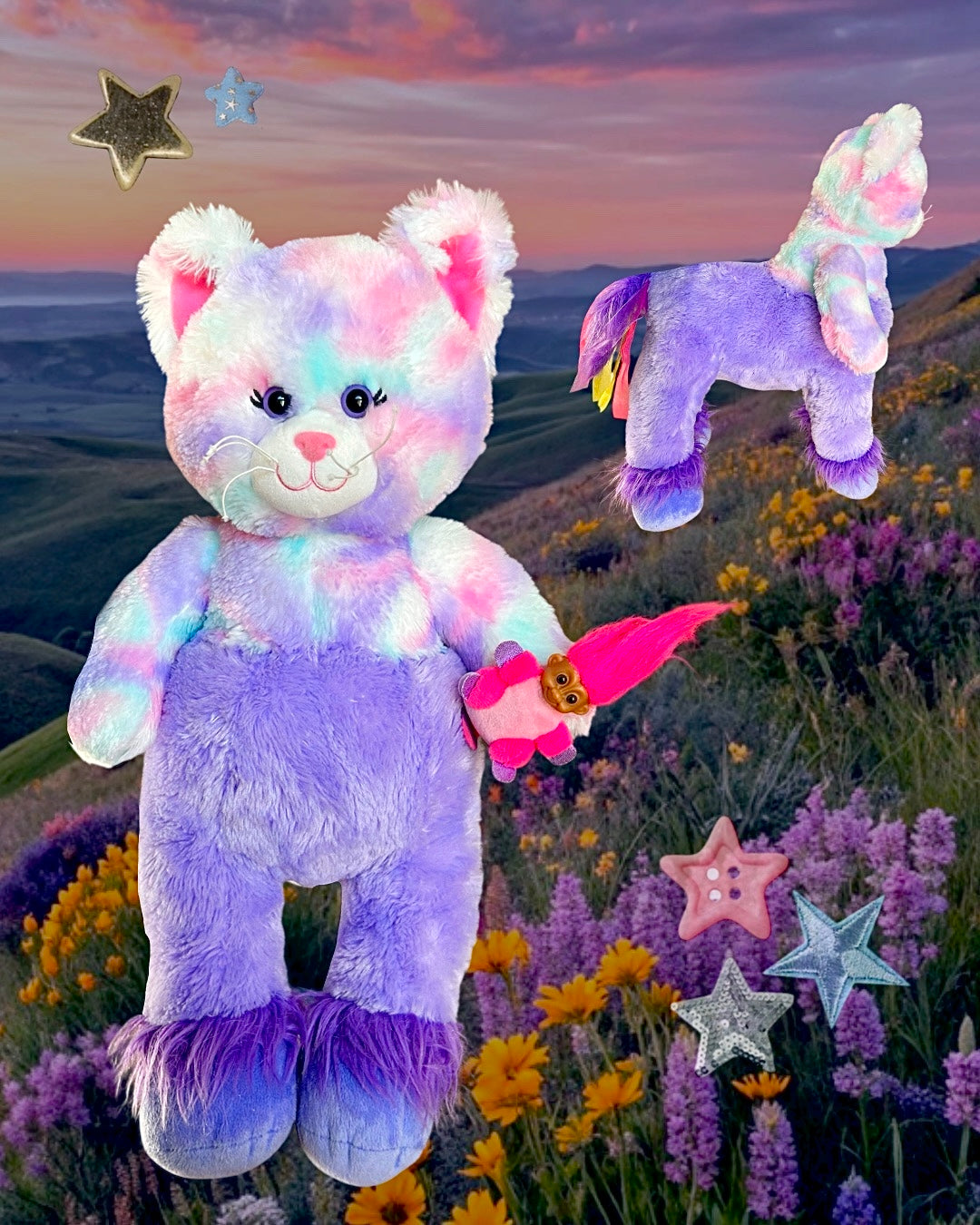 - Teddy head and body on unicorn body, troll raccoon buddy